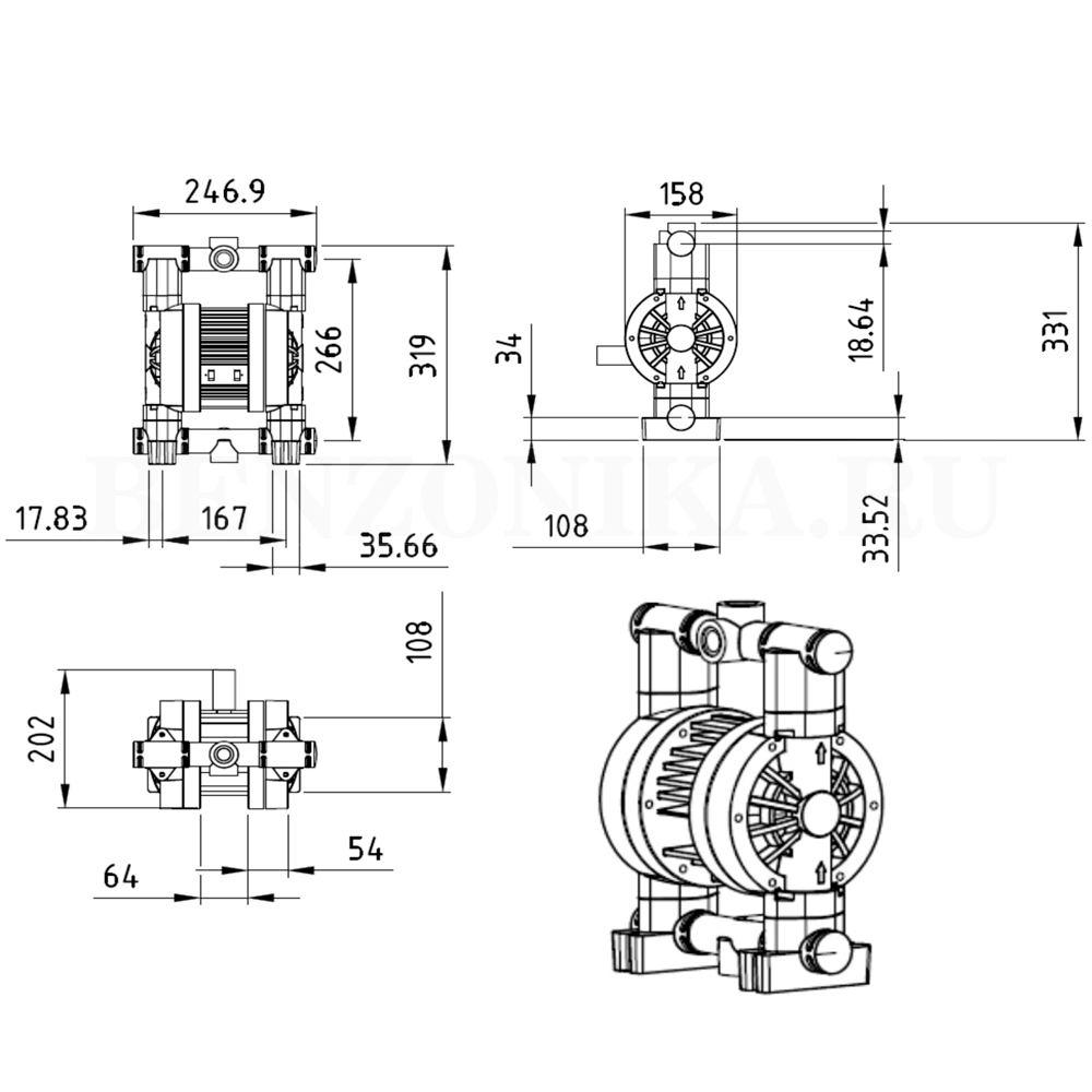 Ruby 015 работает от сжатого воздуха, способен поднимать жидкость на 3 метра в высоту и работать на сухую. Можно регулировать производительность этого мембранного насоса, меняя давление подачи воздуха. Пневматический механизм полностью изолирован от гидравлической части насоса, поэтому утечка при перекачивании исключена.