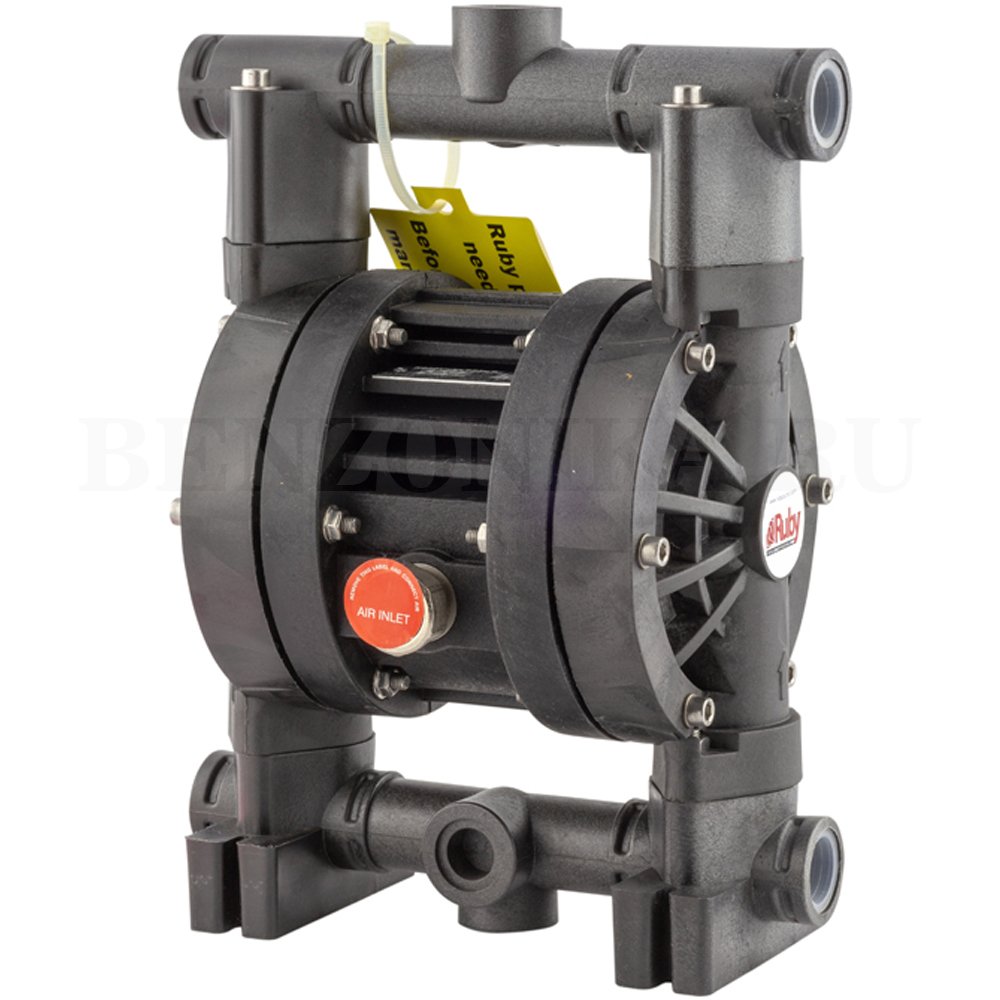 Ruby 020 работает от сжатого воздуха, способен поднимать жидкость на 3 метра в высоту и работать на сухую. Можно регулировать производительность этого мембранного насоса, меняя давление подачи воздуха. Пневматический механизм полностью изолирован от гидравлической части насоса, поэтому утечка при перекачивании исключена.