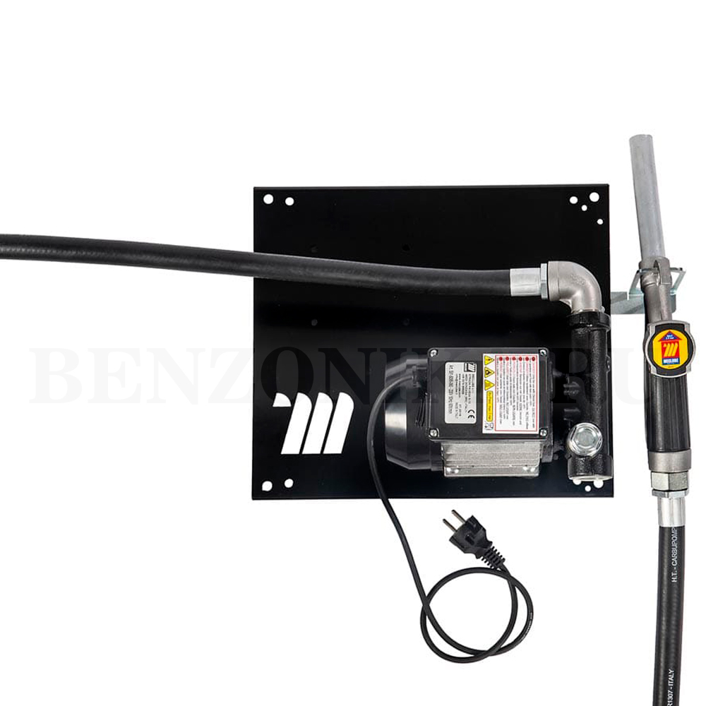Заправочный насосный блок (Настенный узел "COMPACT" Meclube 090-5044-060), оснащённый насосом 220В производительностью 60 л/мин, установленный на металлической пластине для удобного монтажа на стене. В комплектацию входят антистатический шланг для выдачи дизельного топлива (дизеля, дизтоплива, керосина, солярки) и ручной топливораздаточный кран MC100.