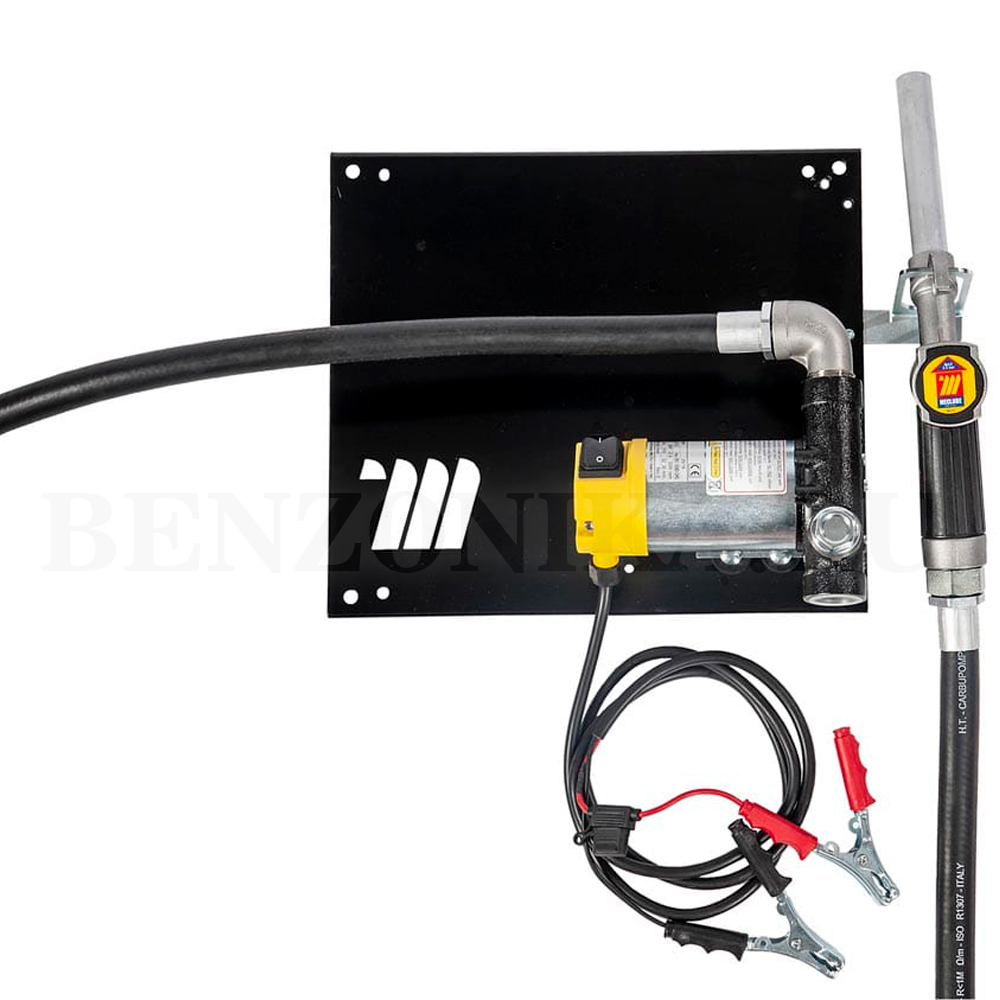 Заправочный насосный блок (Настенный узел "COMPACT" Meclube 090-5044-Z45), оснащённый насосом 24В производительностью 45 л/мин, установленный на металлической пластине для удобного монтажа на стене. В комплектацию входят антистатический шланг для выдачи дизельного топлива (дизеля, дизтоплива, керосина, солярки) и ручной топливораздаточный кран MC100.