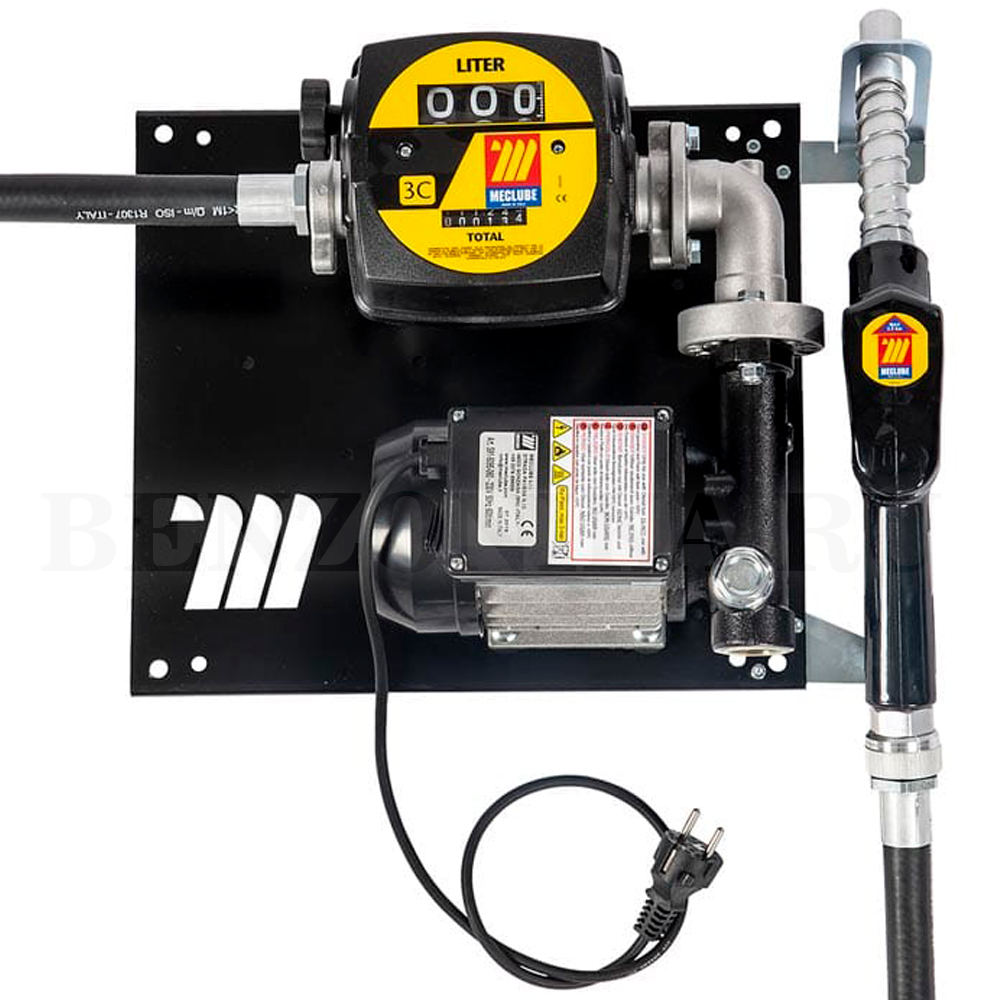 Заправочный насосный блок (Настенный узел "COMPACT" Meclube 090-5045-060), оснащённый насосом 220В производительностью 60 л/мин, установленный на металлической пластине для удобного монтажа на стене. В комплектацию входит антистатический шланг для выдачи дизельного топлива, 3-х разрядный механический счетчик 3C учета дизеля и автоматический топливораздаточный кран.