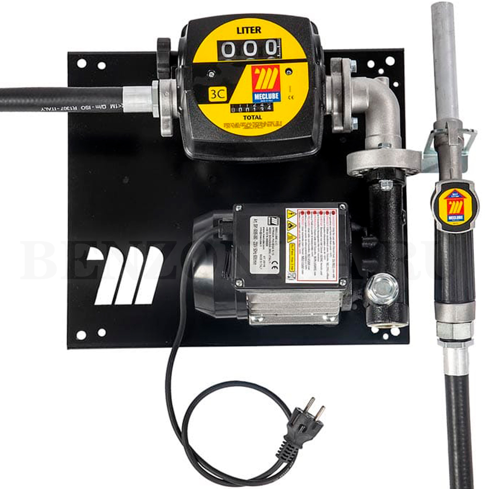 Заправочный насосный блок (Настенный узел "COMPACT" Meclube 090-5046-060), оснащённый насосом 220В производительностью 60 л/мин, установленный на металлической пластине для удобного монтажа на стене. В комплектацию входит антистатический шланг для выдачи дизельного топлива, 3-х разрядный механический счетчик 3C учета дизеля и ручной топливораздаточный кран.
