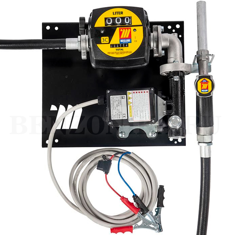 Заправочный насосный блок (Настенный узел "COMPACT" Meclube 090-5046-Y60), оснащённый насосом 12В производительностью 60 л/мин, установленный на металлической пластине для удобного монтажа на стене. В комплектацию входит ручной топливораздаточный кран MC100, счетчик учета дизеля и антистатический шланг для выдачи дизельного топлива (дизеля, дизтоплива, керосина, солярки).