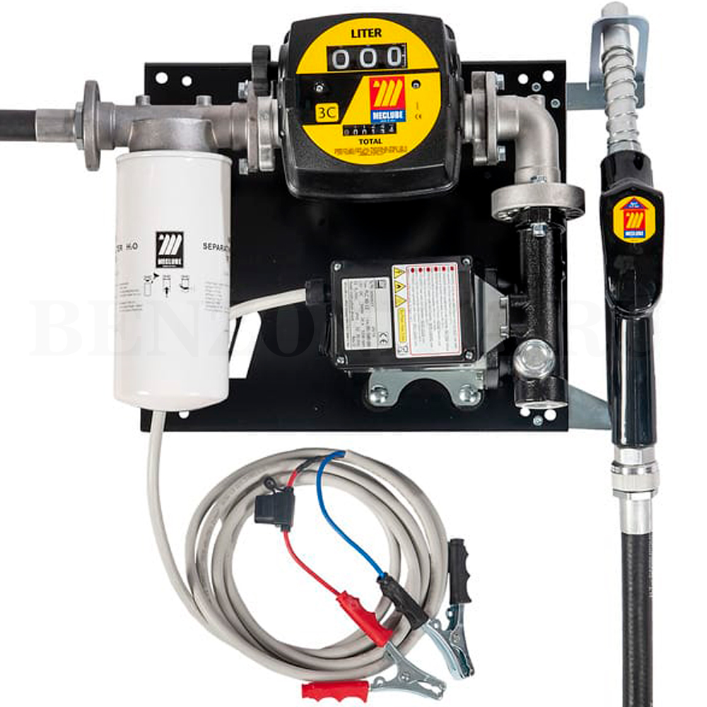 Заправочный насосный блок (Настенный узел "COMPACT" Meclube 090-5047-Y60), оснащённый насосом 12В производительностью 60 л/мин, установленный на металлической пластине для удобного монтажа на стене. В комплектацию входит фильтр-водоотделитель, антистатический шланг для выдачи дизельного топлива (дизеля, дизтоплива, керосина, солярки), счетчик учета дизеля и автоматический топливораздаточный кран PA60.