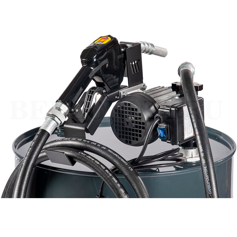 Электрический самовсасывающий насос для дизтоплива, питание от сети 220 В, корпус из чугуна, рабочее колесо из спеченной стали и лопасти из ацетиловой смолы. Встроенный в насос перепускной клапан и фильтр из нержавеющей стали.