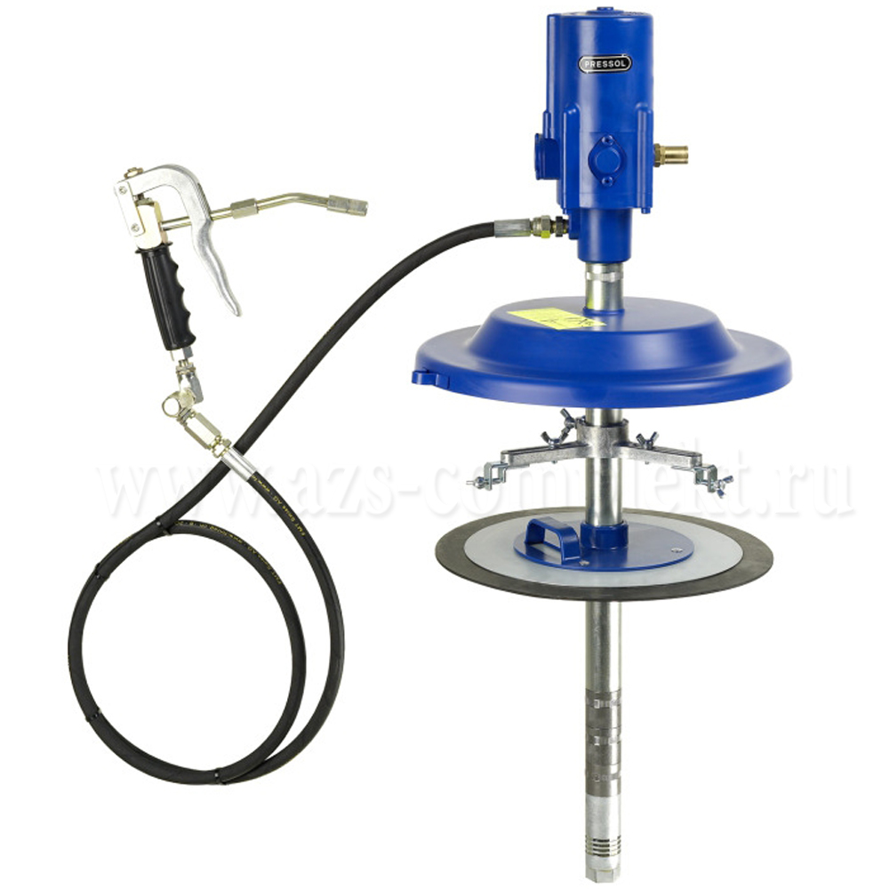 Система раздачи смазки (Солидолонагнетатель) стационарного типа, c пневматическим приводом, производства Pressol (артикул 18 419 051). Предназначена для 20 кг емкостей с диаметром горловины 270-310 мм. Состоит из механизма забора смазки и пневматического насоса модели 50:1. В комплект входят шланг высокого давления длиной 2 м и смазочный пистолет (арт. 18 104). Используется для перекачивания пластинчатых смазок вязкостью от NLGI 0 до NLGI 2.