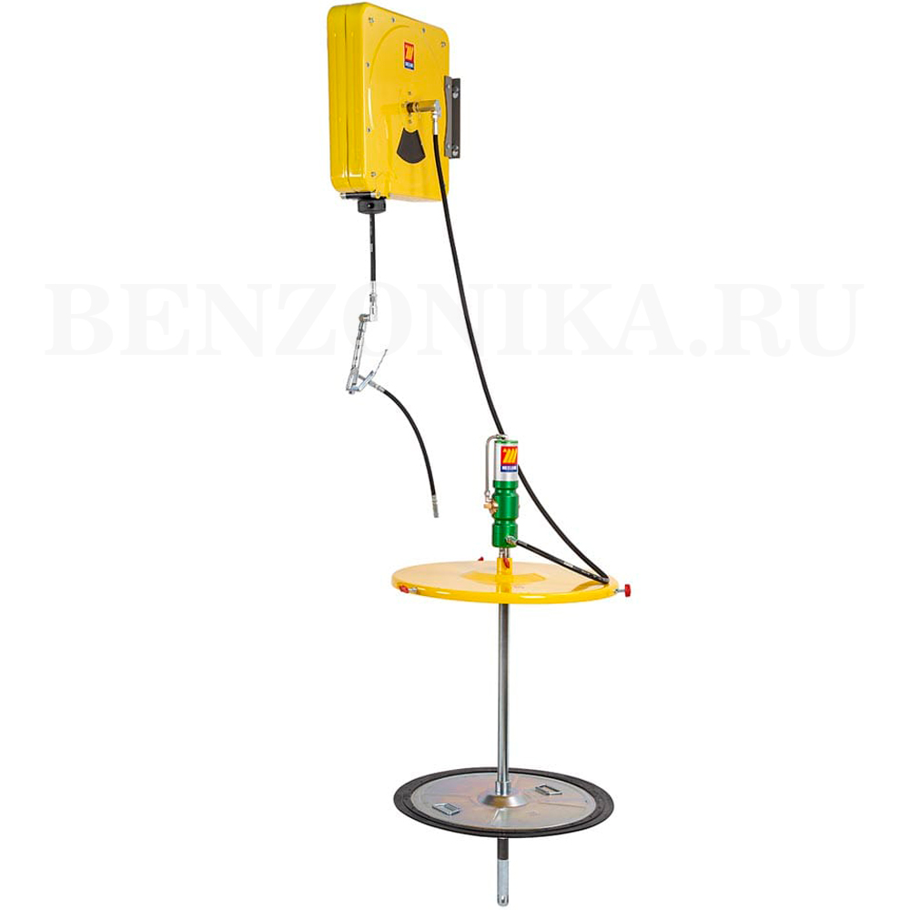 Meclube 013-1138-C15 Насосный комплект настенный с пневмонасосом для консистентной смазки, 60:1, с катушкой предназначен для бочек 180-220 кг. Производительность подачи смазки (при 8 бар): 1600 г/мин.