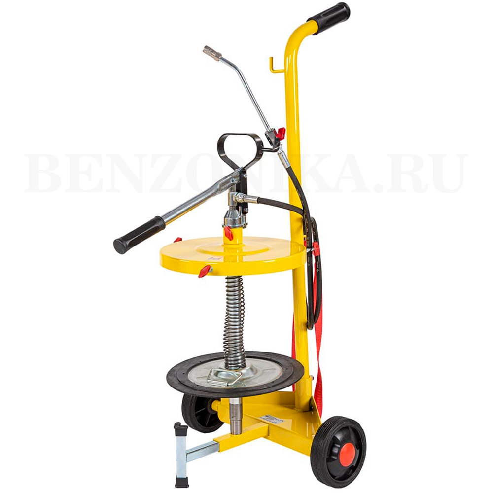 Ручной мобильный насос для перекачки смазки для бочек объемом 18-30 кг. В комплекте ручной насос, тележка, крышка для бочки, следящая пластина, шланг и сливной носик.
