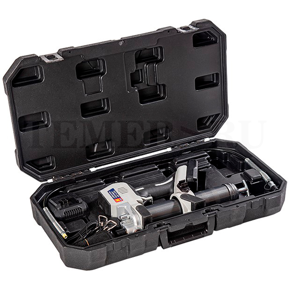 Зарядное устройство защищено от перегрузки (время зарядки: примерно 100% за 60 мин / 80% за 30 мин). Полностью заряженный аккумулятор обеспечивает подачу до 12 картриджей со смазкой при условии свободного доступа. В пластиковом кейсе предусмотрено место для дополнительного аккумулятора.