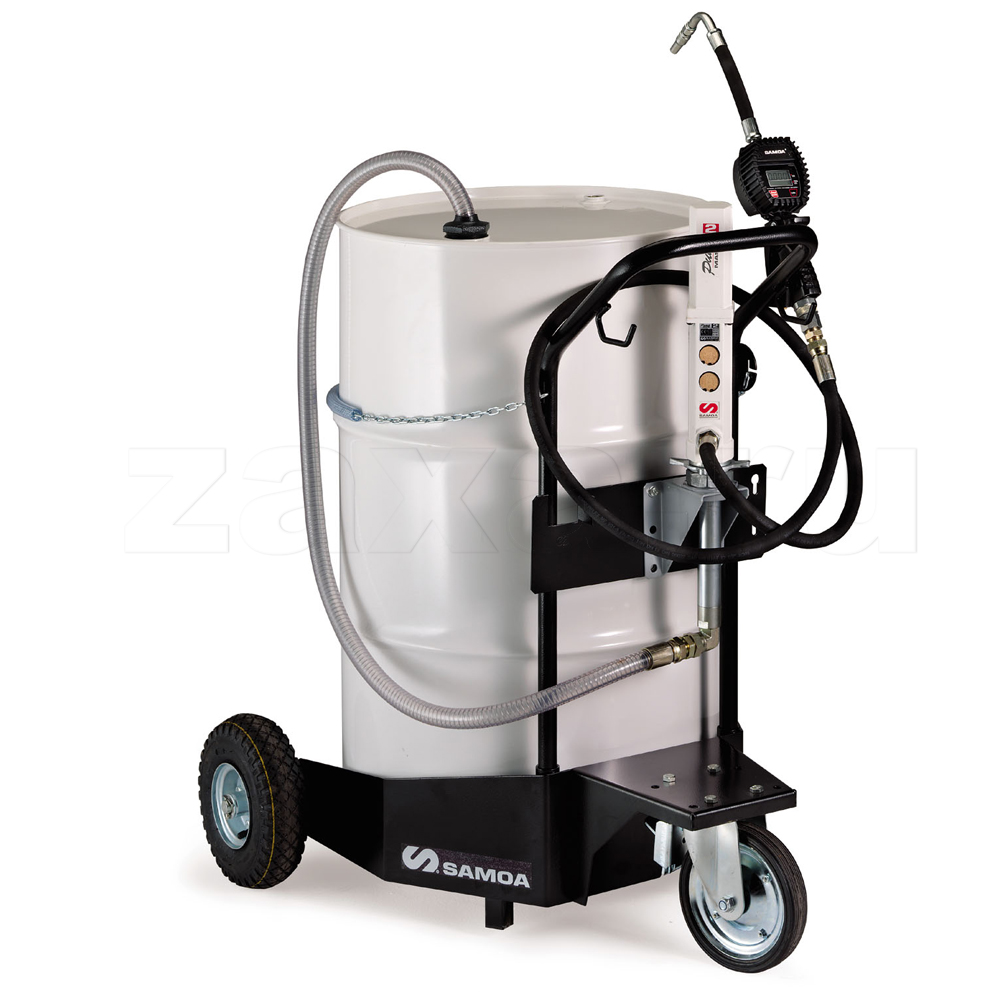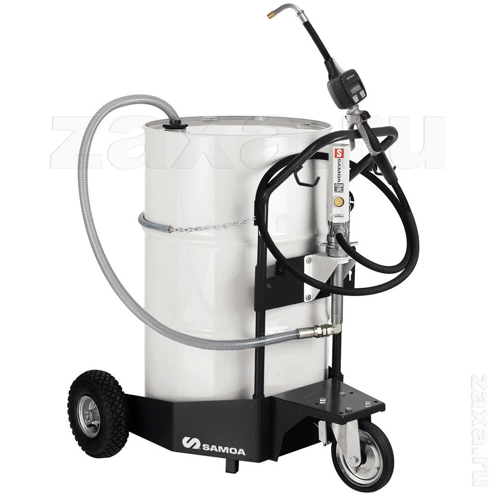 Маслораздатчик Samoa 376610 пневматический (коэф. сжатия 3:1, 10 бар, длина трубы 230мм, макс. производительность 30л/мин), тележка для 200л бочек, пистолет с цифровым счетчиком масла, шланг 3м. Мобильный маслораздатчик для бочек 205 л Насос, монтированный на тележке, упрощает замену пустой бочки.