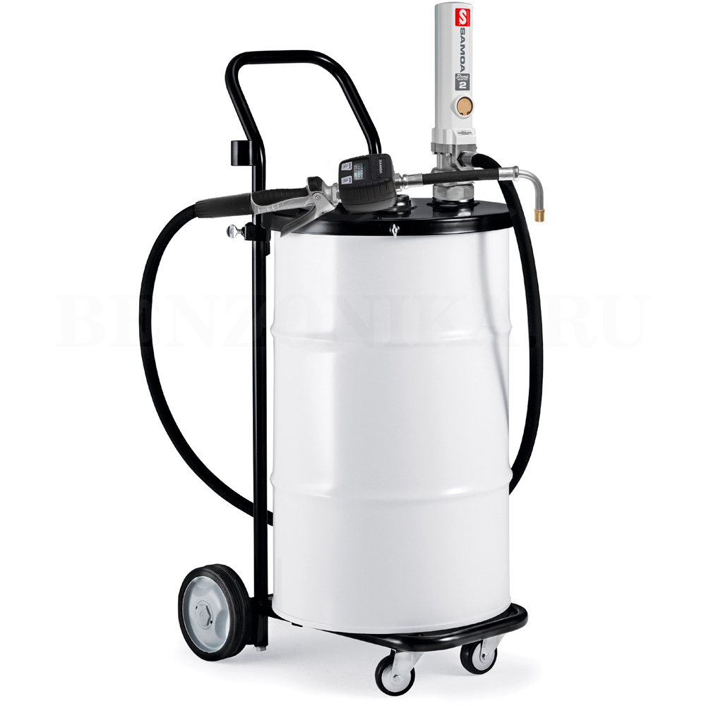 Мобильная пневматическая установка под емкость 50 л с пистолетом-расходомером. Состоит из насоса для масла с коэффициентом сжатия 3:1, крышки для бочки 405 мм с двумя отверстиями, шланга для масла 3 м, 4-колесной тележки для бочки 50 л, пистолета с электронным счетчиком.