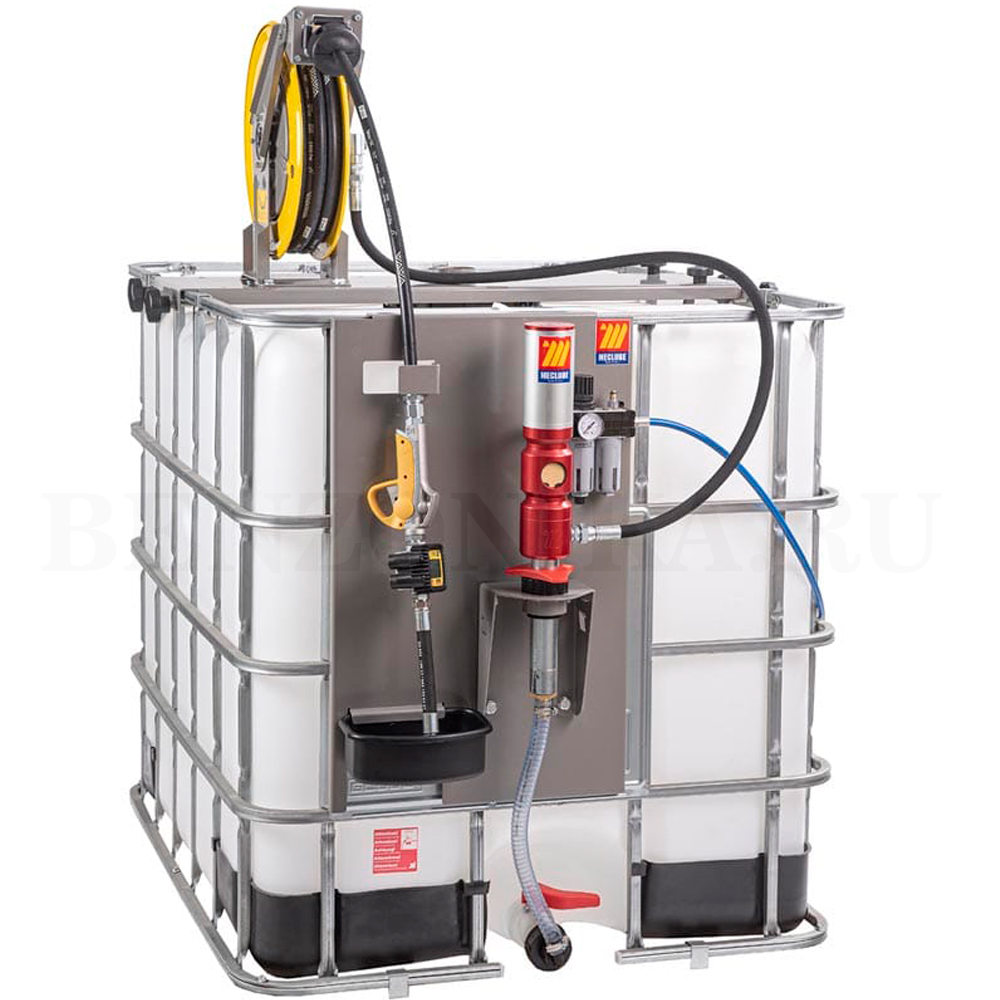 Комплект Meclube 022-1900-000 для раздачи масла, с креплением пневматического поршневого насоса на монтажный кронштейн сбоку IBC-контейнера, катушка установлена сверху ёмкости. Комплект предназначен для выкачивания/раздачи масла из ёмкостей IBC объемом 1000 литров.